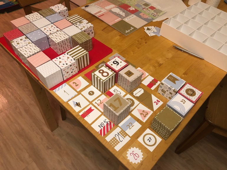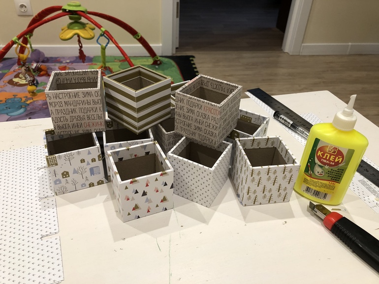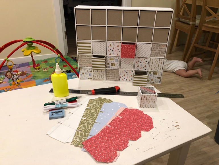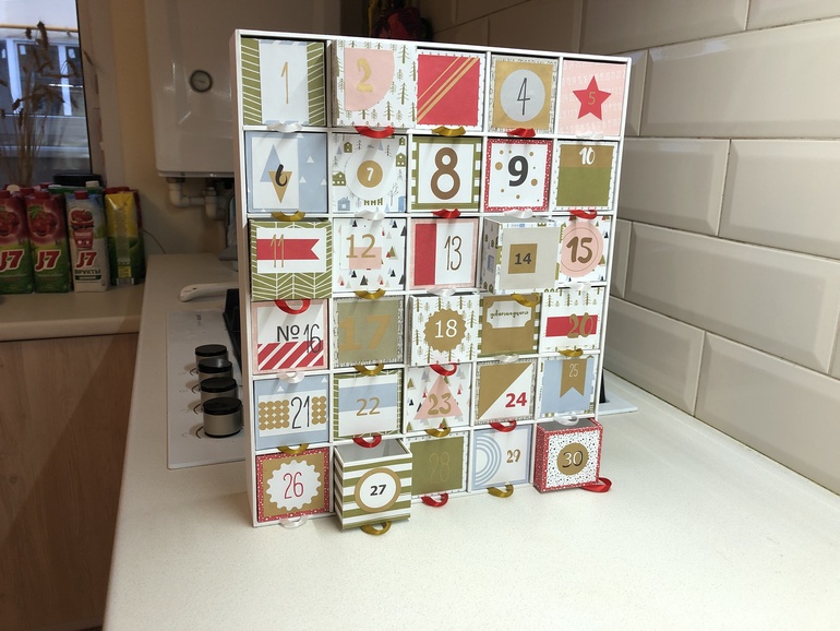 Я же почитала, что вы мне насоветовали про осеннюю хандру, и захотела впервые сделать адвент-календарь. Насмотрелась идей. Решила, что хочу сделать солидно, не на один раз. С выдвижными ящичками. Из толстого картона, 2 мм. Прикинула, сколько чего надо, как делать. Начала предвкушать сладкие моменты творчества. Ну вы понимаете - смысл именно в процессе.
