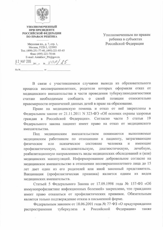 Война из-за Манту и прививок: Павел Астахов подтвердил незаконность отстранений детей от посещения школ и садов и написал соответствующее письмо президенту России.