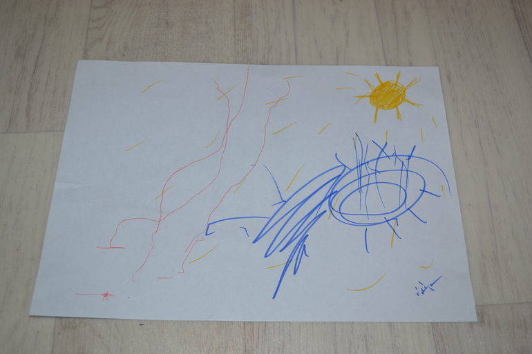 Вот желтое солнышко рисовала я. Показывала Машке, говорю сначала кружочек рисуешь вот так, потом закрашиваешь его, потом лучики рисуешь. Ну Машка без энтузиазма отреагировала на мои слова, и я решила пойти позаниматься делами. А когда стала убираться увидела вот такое солнышко синего цвета! Блин! Неужели это она сама? Кружочки вырисовывала?! Лучики нарисовала?! Я не верю! Ну потомучто до этого у нас сплошные каляки-маляки. А это ж СОЛНЫШКО! Явно солнышко! А вдруг муж поиздевался надо мной? Ух, я его...!