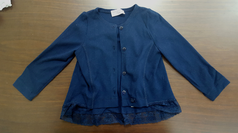 2) Кофточка Monnalisa темно-синяя - маркировка 24 мес. (рукав от плеча 31 см, ширина от подмышки до подмышки - 28 см, длина изделия по спинке - 34 см). Одевали пару раз, зацепок нет, в хорошем состоянии. Цена: 1.500 руб.