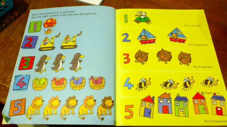 Учили, что после 2х идет 3, а не 4, как он упорно уж с полгода считает по-англ. и по-русски (по-тайски считает правильно). Учили по книжке с наклейками, что Ира из Сингапура привезла. мне вообще нравится.