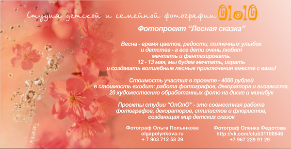 Приглашаем вас принять участие в фотопроекте "Лесная Сказка" - волшебство цветущего сада, декорации и аксессуары ручной работы и, конечно, прекрасное весенне настроение.