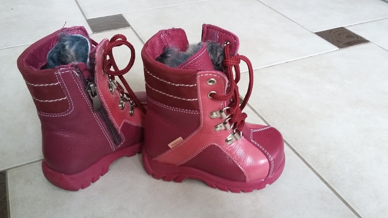 Состояние новых-одевали пару раз в коляске (били тесноваты нам ). Полностью натуральная кожа и мех. Шнуровкой удобно регулировать по полноте ножки, сбоку на молнии-удобно одевать.
