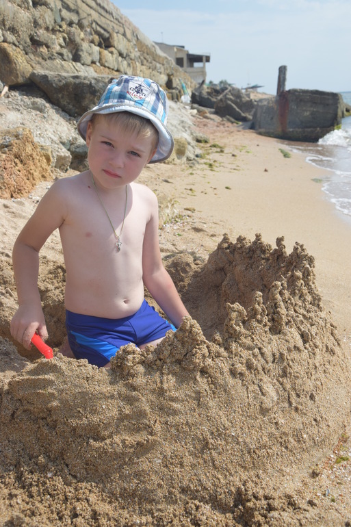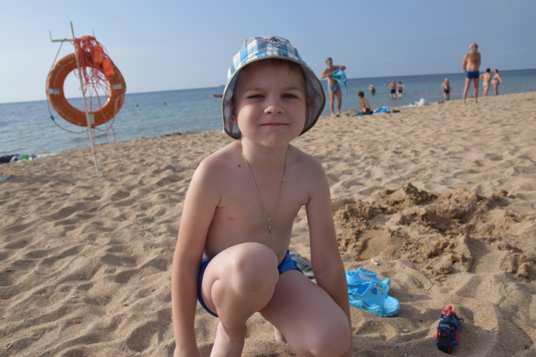 Строили замки, брызгались, играли в игры, рыли траншеи, колодцы, ловили крабиков, кормили чаек, плавали и загорали. С погодой повезло. Воздух 26-27, иногда 29. Вода -25, утром прохладнее. Дождь был 1 раз,и то ночью. Супер погода!
