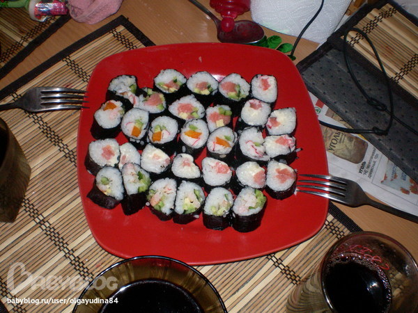 Девочки,всё никак не могла решиться сделать сама роллы,хотя их просто обожаю,но многие говорили,что в домашних условиях получается хрень полнейшая. Ну,всё таки решилась. Вот мой рецепт(может кому понадобится) Что понадобилось:рис(обычный круглозерный,(для заправки риса-рисовый уксус,соль,сахар), листья нори, и начинка,тут какая у кого фантазия и бюджет. В наших магазинах разнообразие не велико,да и для первого раза решила по-проще сварганить что-нибудь:форель малосоленая,сыр сливочный Хохланд,креветки,крабовые палочки,огурец,перчик,авокадо и разные комбинации с этими ингредиентами делала. Получилось 6 колбасок,по 6шт каждая. Муж оценил на "4",но для первого раза ничего.Кстати,делала я вечером,поужинали,а остатки в холодильник положила. Видно,роллы пропитались и на сл. день были ещё вкуснее. Фото предоставляю,что смущает-наличие вилок,палочек не было. Девочки,а какие роллы у вас хиты,с чем?Хочется взять на заметку.