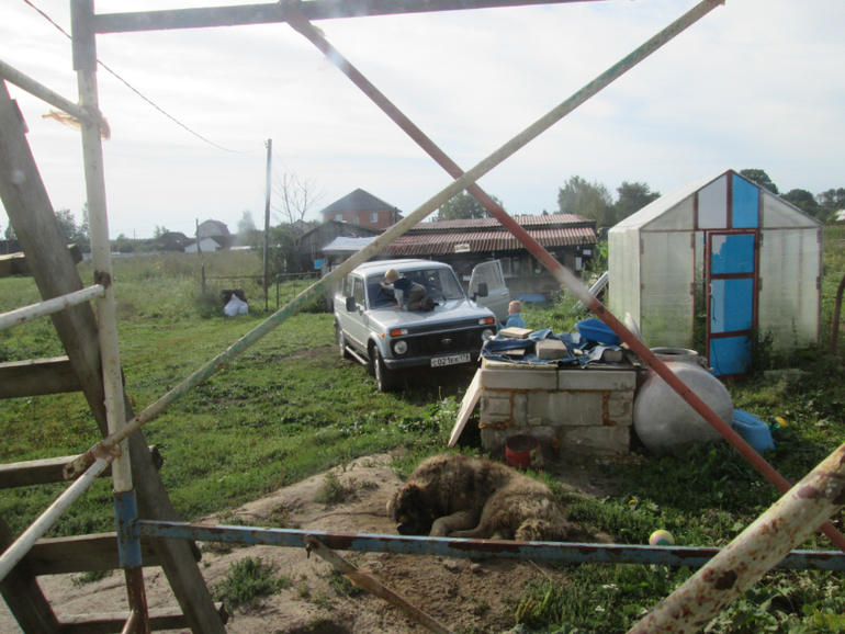 Так +12 по утрам, и мы на этой площадке потом под такой ливень попали!!!! Хорошо ветровки у меня в сумке были)))Это Кирюша, у него в будке они от меня прячутся, а ещё ключ от дома к нему в будку на гвоздик вешаем)))))
