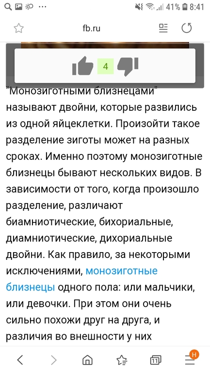 Плацента одна ,но амниотических мешочка два , из-за общей плаценты ,однояйцевые,а промежуточные или полуидентичные ,мне всё равно ,это не исключает из однояйцевость ) так что двойня у меня точно однояйцевае и предположительно разнополая ,я склонна больше верить врачу чем вашим убеждениям) существование мизерного факта даёт шанс на разнополость.