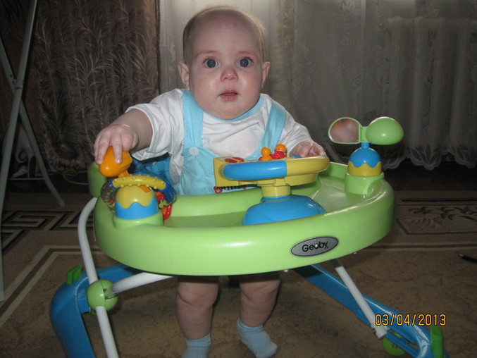 Буквально за 1-2 дня до полугодия Владик научился переворачиваться со спины на живот через левую сторону. Вправо он давно умеет, а слева видно попка тяжелее)) Еще вчера появились новые звуки - ба, ма, па (чтото вроде этого), ато только укал и букал (как машинка)). Сидит еще не очень уверенно, опирается на ручки или с нашей поддержкой. Я еще боюсь его сильно садить, как гляну на спинку горбатую, все кажется что рано еще. При поддержке хорошо опирается на ножки и переставляет их - скоро побежим)))) Любит в ходунках сидеть, ножками отталкивается, в основном вбок и назад. Начал взрослых распознавать, раньше улыбался всем подряд, а теперь может и заплакать, зато деткам рад всегда и своим знакомым и чужим. Когда работатет телевизор обращает внимание на "знакомые" звуки (например реклама), которую часто показывают. Наулице гуляем пока 1 раз в день, но скоро будем на 2 раза переходить, люльку еще не меняли на прогулку, пока не вижу необходимости, потому что в основном спит на улице.