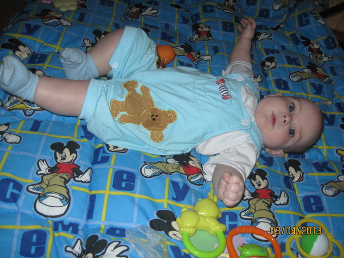 исполнилось сегодня моему малышу. Время пролетело ну оооочень быстро. Вроде вчера еще в роддоме лежали, а сегодня ребеночек уже такой взрослый. Весит около 8 кг, рост 70 см. Кроме груди кушает каши - гречку и рисовую. Рисовая без соли и сахара не очень пошла у нас, поэтому добавляю в кашу бананчик, и лопает с удовольствием. На следующей неделе, думаю, начнем овощные пюрешки кушать. Будем покупать баночки.