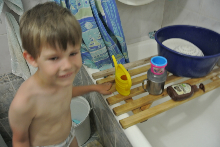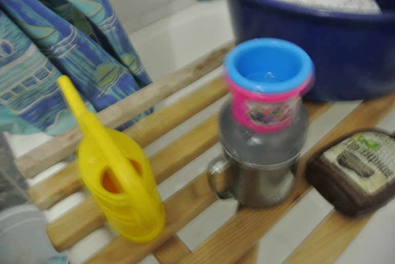 Сашуля мастерил в ванной: наполняя формочки водой - наполнялась и нижняя часть конструкции - мерный стаканчик для жидкого порошка