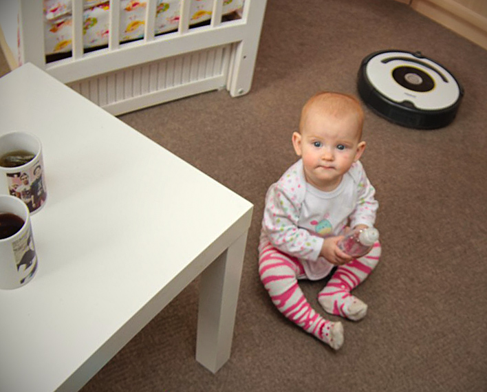 показывала гостям, как работает робот-пылесос, который отчаянно собирал с ковра крошки от ее хлеба))