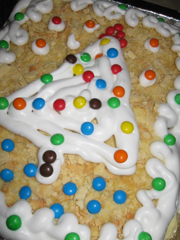Когда коржи перемазаны, последний оставшийся корж покрошить и украсить им торт!