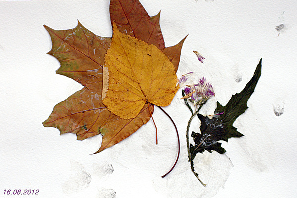 рисуетНаткнулась я тут недавно на прошлогодние запасы листиковцветочков сушеных. И не дожтдаясь осень, мы с Аришкой уселись за гербарии. ПВА, кисточка (Аришуля тааак сильно нажимала на кисть, что вылезла краска :( ), акварельная бумага. Я сидела рядышком и прижимала листья, т.к. они не мгновенно приклеивались дочуня сердилась.