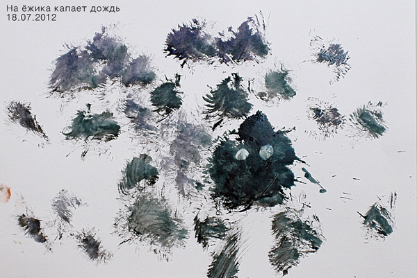 ЮБ просиял (потрясающей харизмы человек! такой добрый и внимательный, всё время разговаривает с Аришкой, мне как маме прям бальзамище на душу :) ), спросил кто это, Ариша ему всё рассказала - мол, ёжик, он под дождем. ЮБ - а почему дождь черный? Арина - ночь на дворе. ЮБ рассказал, как на приемной комиссии они рисуют кляксы и просят поступающих рассказать историю.