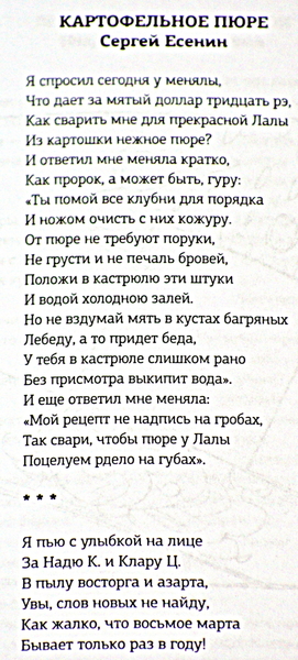 АП - а вот послушайте стих, это точно к моему стиху. И прочитал нам про каляку-маляку, которую порвал козел и теперь по земле ходят - каляка отдельно, маляка отдельно. Вот такая вот печаль.