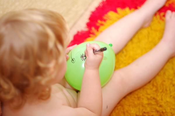 До завтрака пара набросков, домой приехали после 7 вечера, командирчик достал из сундучка шарики и попросила их надуть, попыталась порисовать на шарике карандашом, но проткнула и я дала Арише маркер для СD.