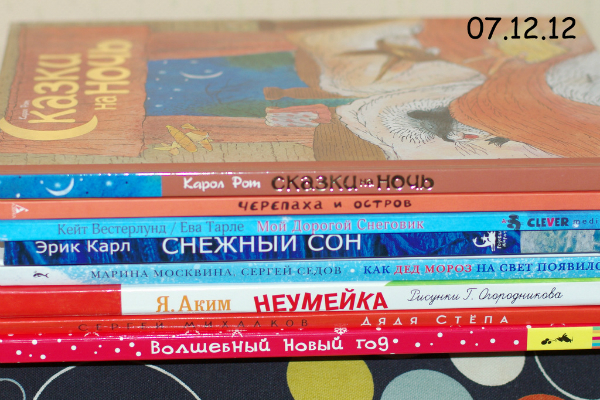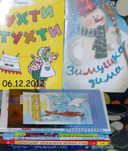 Почитали тонкие книжицы. Наконец-то пошла сказка про Ухти-Тухти. Читаем нг книжки. Прочитали половину "Как ДМ на свет появился" фоном. Арише еще рано, а мне понравилось. Много нг и зимних стихов.