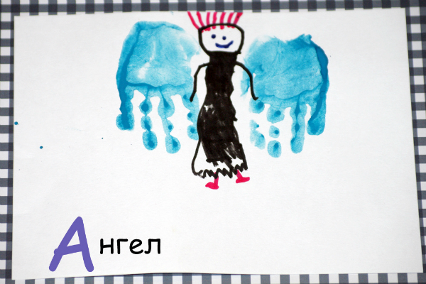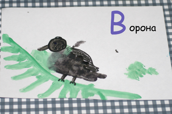 Я спрашивала, что мы нарисуем на такую-то букву, Арина отвечала и в зависимости от этого я красила ей пальчики, а Аришка шлёпала. Потом сама дорисовывала кисточкой или фломастером. Я рисовала толовище гному и полукруги бамбуку и спину вороне (лучше бы я этого не делала). Почерк у меня жуткий, сами буквы я не писала, если мы доделаем алфавит, то дедушка напишет нам буквы.