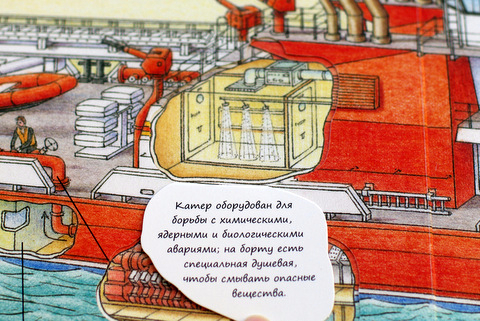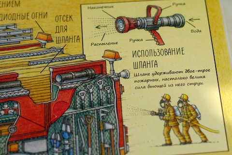 Кроме пожарной машины и скорой помощи, в книге есть информация о полицейской машине, пожарном самолете,подводной помощи, пожарном катере, медицинском вертолете и спасателях на море.