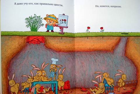Еще одна малышковая книга для Агаты. Небольшой формат, яркие иллюстрации, мало текста, но очень неожиданная развязка. Мишка очень переживает из-за того, что один из кустов не цветет, он прилагает массу усилий, чтобы появился бутончик, а параллельно толпа наглых зайцев под землей уплетают морковку, над которой трудится мишка.