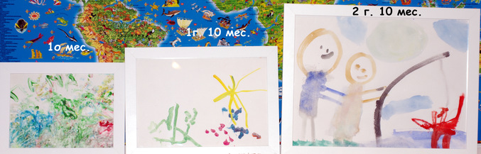 С субботы рисовать уже будет совсем другой трёхлетний человек, поэтому срочно разгребаю и показываю малышковые художества. Всё так же миллион однотипных человечков (много без рук, но с длинными ногами, в брючках и сапожках).