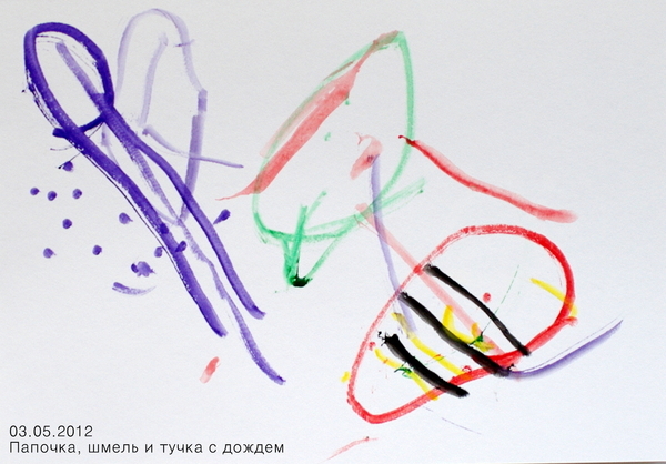 Пока Ариша ждала полдник (и пока папочка придёт через часик (с) ) она нарисовала папочку (зеленый с красной челкой), шмеля (полосатый с фиолетовыми крыльями) и тучка (дождик-дождик лей, лей) с ливнем и дождиком: