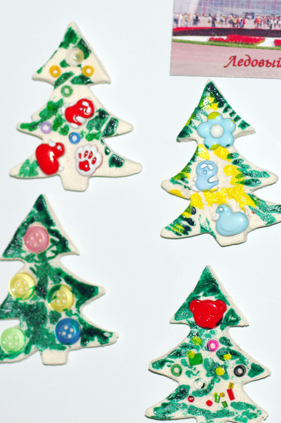 Соленое тесто, пуговки, бусинки, акрил. Магниты приклеила на момент - ночь провисели нормально :)