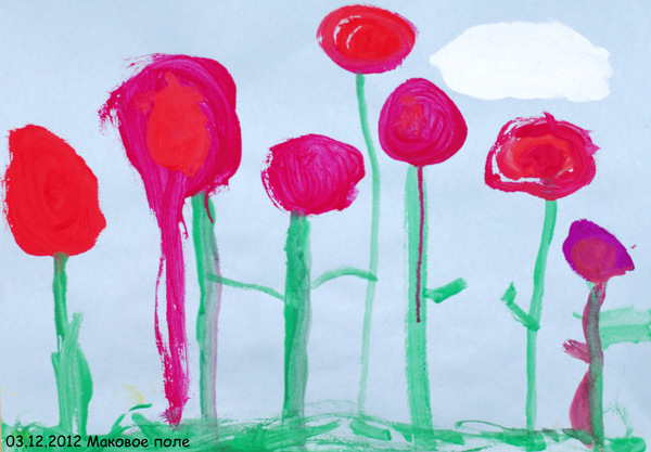 Надо сказать, что Ариша не любит штампики, гуки, валики. Красками рисует только кисточками. А тут мы вывалили все мягкие ирушки на пол, я рассказала, что вот этот клоун умеет рисовать и рассказывать истории. И вот этот огурец. Показала, как мазать краской (Ариша сама выбрала цвет) и один раз чпокнула. Ариша - "маковое поле!" и давай шлёпать. Потом - "мама покрась клоуну ножки желтой краской". Взяла клоуна - "клоун ходит по полю".
