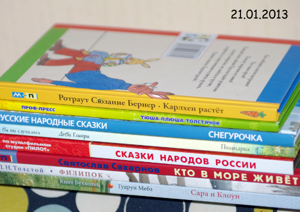 Еще читали что-то из Карлхена, Тишку-Плутишку, Снегурочку, тонкие стихи, книжки с окошками про Эксперименты, про Лошадей, про сад.