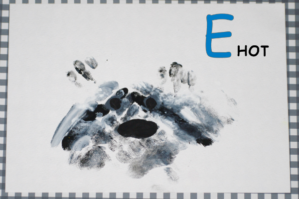 Что будем рисовать на каждую букву придумывала Аришка. Я красила ладошки. Еноту носик рисовала я.