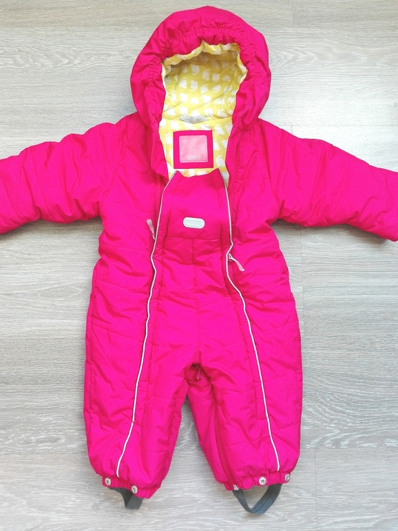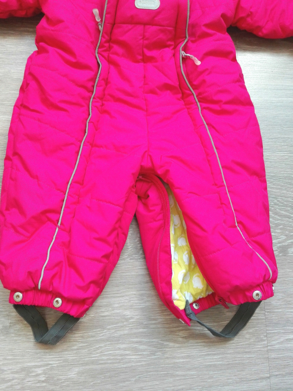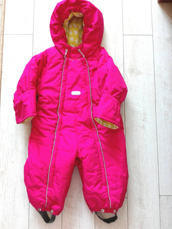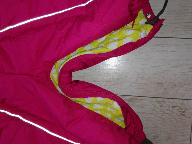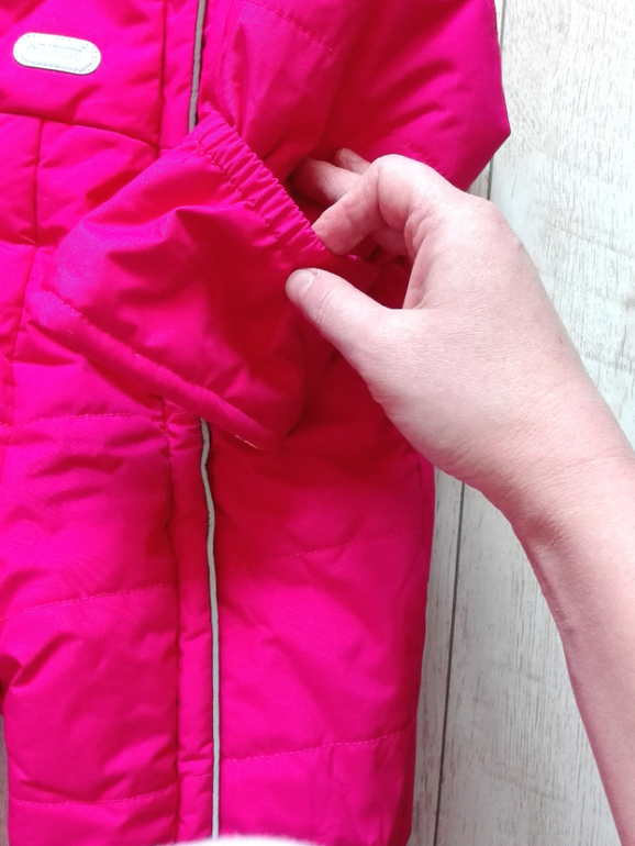 Снизу между штанишек молния,на рукавах поворачивается типа варежки.Резинки для обуви.