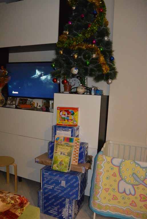 Посылочки к нам шли одна за другой, последнюю мы забрали прямо 31 декабря! Но от Макара все прятали и только в новогоднюю ночь Дед Мороз положил подарки под елочку. А подарков вышла целая гора, ростом с Макара!