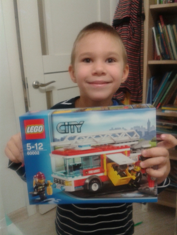 Выбирал сам. Его любимое лего, да еще и пожарная машина! Мы его еще не собрали, т.к. поздно привезли домой, как соберем-покажем;-))