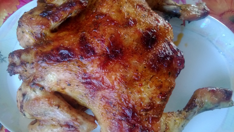 Смазать курицу маринадом , можно дать постоять несколько часов . Запекать в духовке 1 час, при температуре 200 градусов.