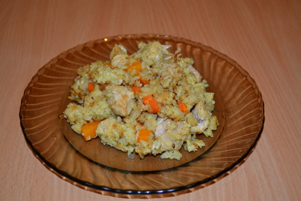 Положить все ингредиенты в кастрюльку и поставить на режим "плов".