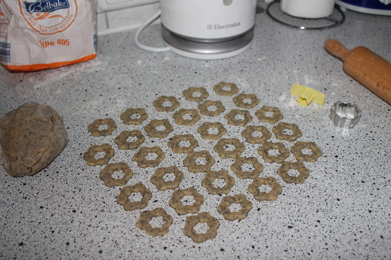 1 яйцо, и 2ст.л. мака Из этих продуктов замешиваем тесто, и убираем в холодильник на 2-3 часа.