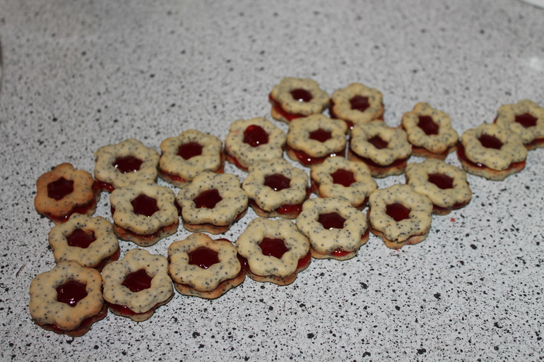 После того, как наши печенюшки остынут склеиваим их по две вашим любимым джемом (у меня клубничное желе) Лучше будет, если ваш конфитюр будет однородным, без кусочков фруктов.После этого посыпаем сахарной пудрой и але-оп! ...... ваши вкуснейшие печеньки готовы! И как это ни странно, но чем дольше это печенье будет лежать ... тем мягче и вкуснее будет!