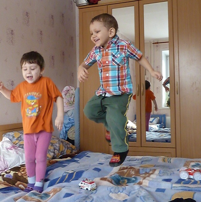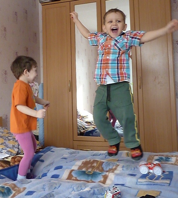 Сама боюсь!Гоняю с кровати.А тут был в руках фотоаппарат, а дети начали прыгать!Поймала момент.