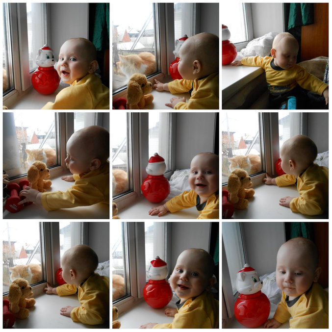 Сам встает везде где можно ухватиться ручками. Делаем ладушки, правда только одной ручкой хлопаем по маминой руке )))) Рассматриваем внимательно рисунки, любим рвать журналы и газеты. Издает разные смешные звуки:) Особенно видя перед собой кису или собачку, так визжит и радуется. Вот мы кису пытались за окном поймать ))))))