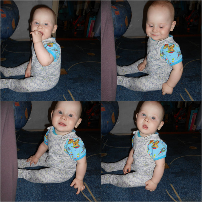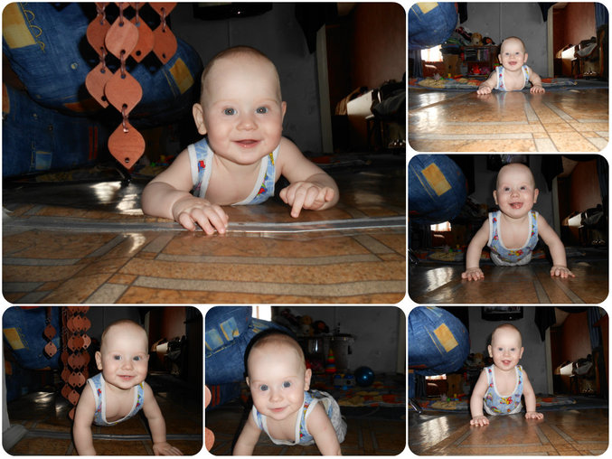 Зубов у нас уже 4\2 )))) Мы уже много чего умеем:) болтаем на своем языке, иногда получается "дай", "баба", "папа", старается повторять, когда ему говоришь короткие слова)))) но "мама" ни в какую...... Вчера наш крошка на ручках у бабушки показал мне ручку и пытался складывать пальцы в кулачек, как будто к себе зовет )))) так интересно было, но заснять не успели .... Ползаем хорошо, пытаемся на четвереньках ползать.