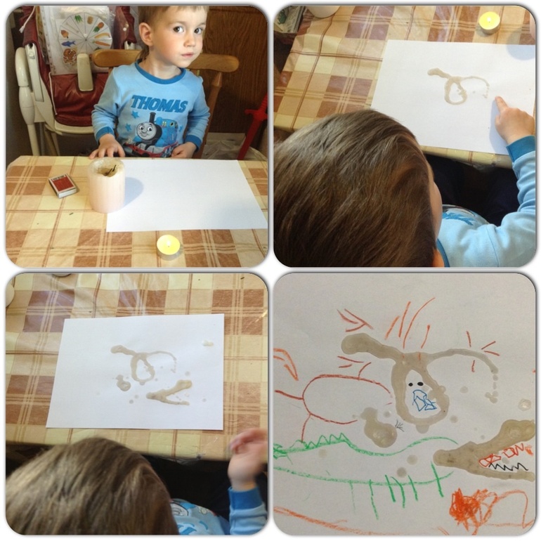 Мы выливали воск на бумагу. Много обсудили интересных вещей. Например, что горячий воск жидкий, текучий, а холодный твердый. Смотрели как воск таит и застывает.