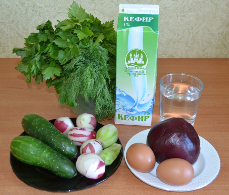 свекла и яйца варёные, свежие огурцы, редька (лучше маргеланская) у меня её мало оказалось, я редиску взяла, зелень любую, какую раздобудете, заметила сельдерей придаёт обалденный аромат - все тру на крупной терке, примерно все в равных пропорциях и заливаю кефиром с водой (50 на 50) яйца можно на четвертинки как я сверху. Ещё 1 зубчик чеснока добавила, посолила и поперчила. Ням-Ням, быстро и со вкусом! Это ещё не все, я сегодня отважилась и пошла на фитнес, а тренер то послушная девочка оказалась, мучайте говорю меня по полной! Господиииииииииииииииии, зачем я это сказала))) Сижу я сейчас, а внутри так все трясётся, что по клавишам с трудом попадаю!!! Я получила столько эмоций, но это уже история на завтра. За то я теперь к кофе смогу пару кубиков шоколадика позволять. Молодец Наташа! А вы ходите на фитнес?