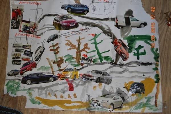 И фантазия пошла, истории сочинялись на ходу! Размещал и клеил машинки - эти спортивные, они участвуют в гонках, оп, одна съехала с трассы на городское шоссе и врезалась в желтый фиат, а его догнал серебристый БМВ, разбита фара, ей срочно нужно в автосервис, но вначале дождемся полицию... В яму попал джип, сам выбраться не может, его взяли на буксир, сейчас....вжжжж.... В автомобильном магазине машины ждут своих покупателей. У машины закончился бензин, приехала на заправку. Газель въехала в грязь, она большая, справится...