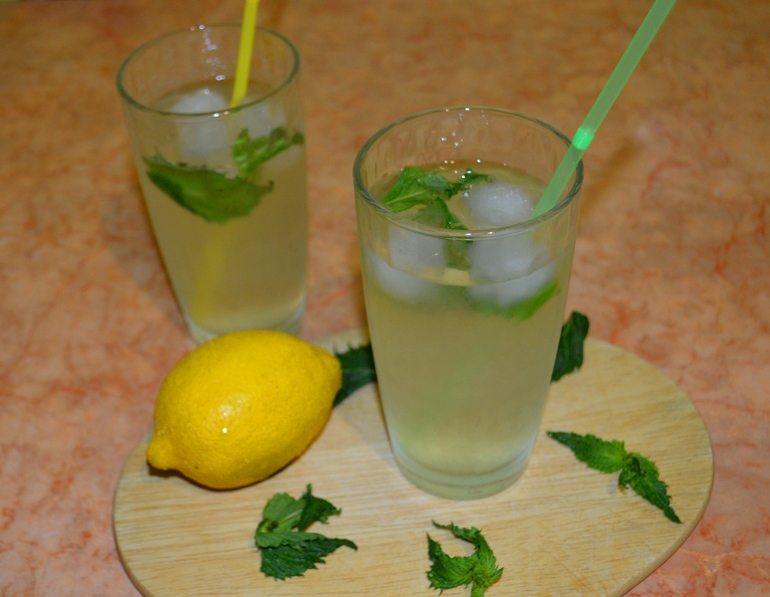 С лимонов снять цедру. Очистить белую кожицу (она нам не понадобится). Мякоть порезать небольшими кусочками, отжать из нее сок. В кастрюльку положить отжатую мякоть и цедру лимона, листики мяты, сахар, немного растереть деревянной ложкой. Залить водой, довести до кипения и проварить 1-2 минуты. Напиток остудить, процедить, добавить ранее отжатый из лимонов сок.