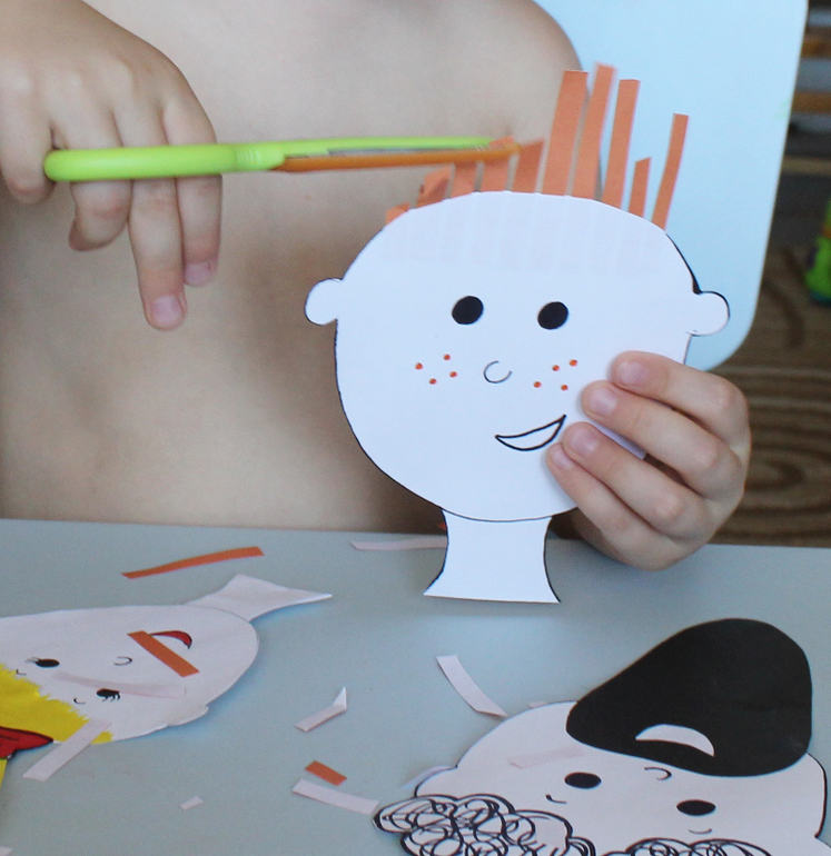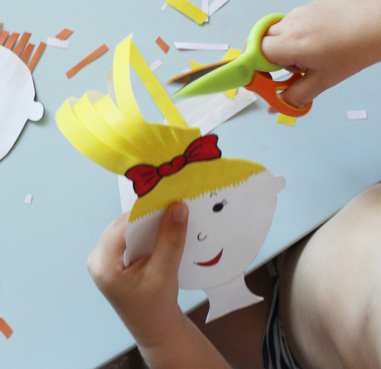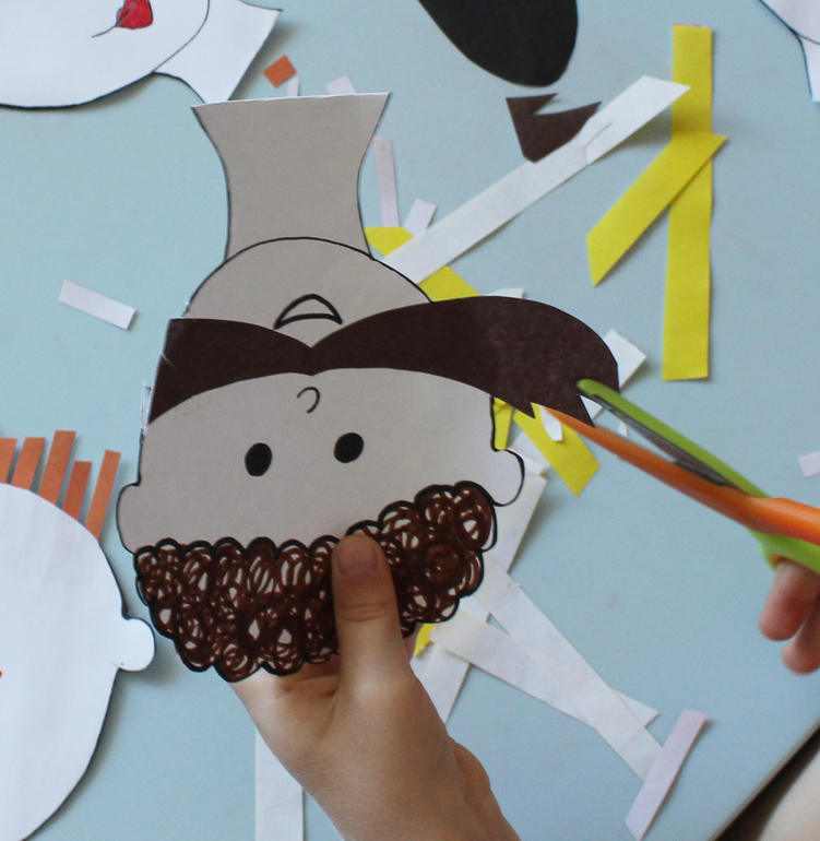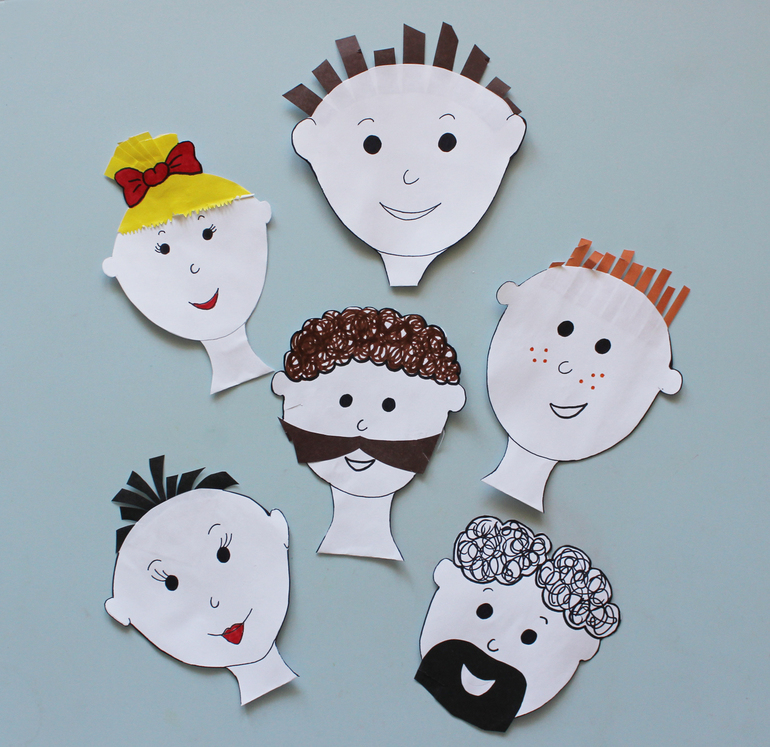 Лист А4 свернуть пополам (если делать в один слой, то бумага будет сильно загибаться из-за тяжести волос), нарисовать овал и лицо человечка и вырезать. Из цветной бумаги вырезать волосы, усы, бороду и приклеить к шаблонам. Обе половинки бумаги склеить (кончики волос остануться внутри) и можно приступать к делу.
