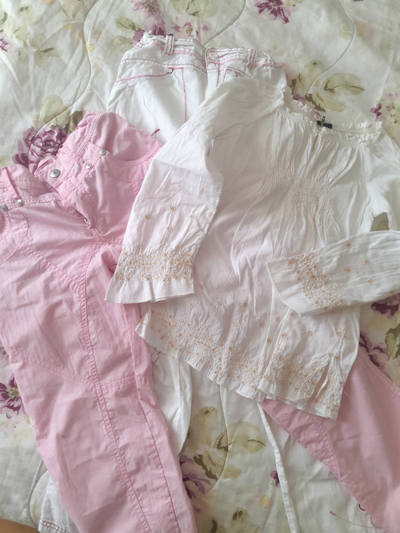 Две пары легких брюк для девочки розовые и белые с вышивкой. Хб. Покупались для поездки на море, соответственно, надевались считанное количество раз. На рост 140, примерно. К ним беленькая легкая блузочка.