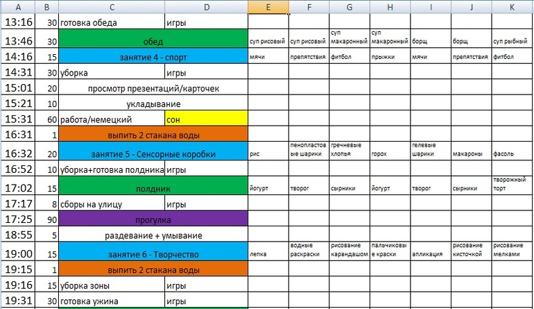 P.S.Подсчет времени в самой левой колонке сделала автоматический, так как надоело его пересчитывать после каждой корректировки. Если кому интересно, то можете скачать пустой шаблон здесь (http://www.fayloobmennik.net/3842648) и сделать на его основе собственное расписание. Вам надо будет ввести в ячейку А2 время своего подъема, а также для каждого этапа указать время, которое для него требуется (колонка В).