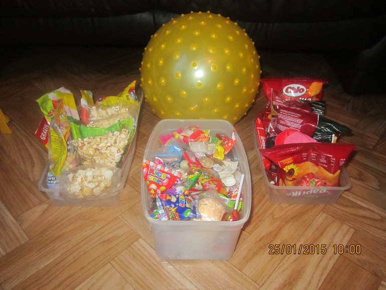 Кстати, оказалось, что сидеть в коляске это более "выгодно", чем бегать и ловить конфеты, так как многие в процессии просто подходили к нему и давали ему в руки сладости. А один мальчик даже подарил ему мячик. Вот наш "улов".