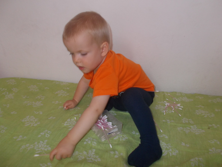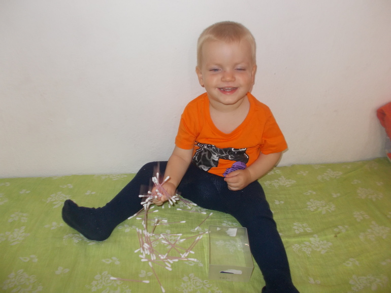 Так как спичек в наличии не нашлось и где они продаются в Германии я не знаю, то заменила их на ватные палочки. Правда, при выполнении задания Стефан пытался их брать рукой (ладошкой), а не пальчиками, как я показывала. А собрав, высыпал опять. Долго он так играл ))))