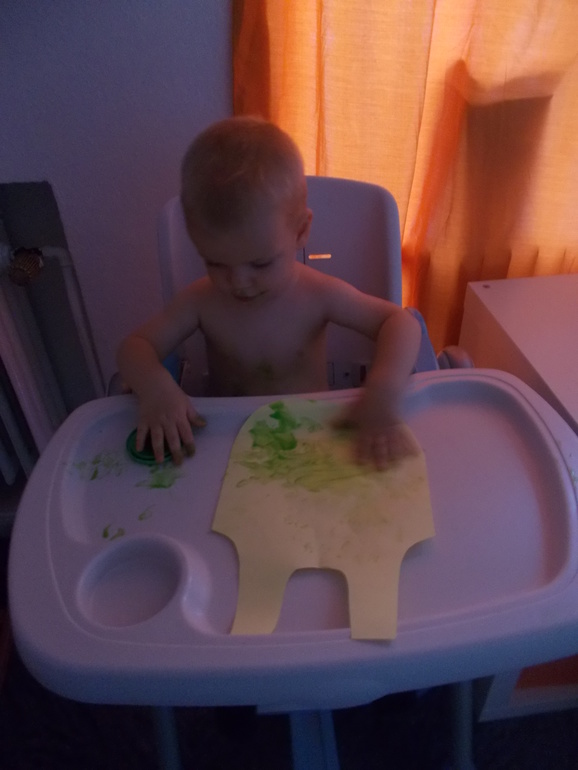 Потом раскрасили фартук для бабушки, но так как фотографий у нас нет, то тоже изменили шаблон. Я хотела, чтобы он сделал фартух в горох, но он пальцем рисовать не захотел, а просто размазывал краску всей ладошкой.